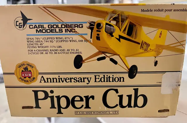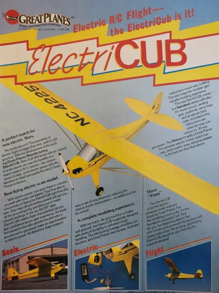GreatPlanes came out with the original Electric Cub that had a brushed geared system in it. It was a 3 channel with throttle, ruder and elevator. Had a N# of NC 42257